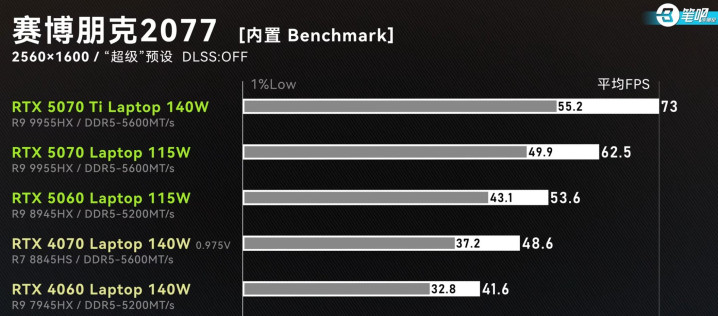 如果对CPU能效没有太高要求,但是希望CPU+显卡的整体性能表现更好的话,那么这台机型就是3款产品中显卡配置最高的。RTX5070的CUDA数量比RTX5060多了1000多个,功耗范围也更充裕,在《赛博朋克2077》这类吃显卡的游戏中,RTX5070的性能提升幅度还是比较大的,平均帧越过了60帧大关,跑高画质3A游戏更舒服一些。