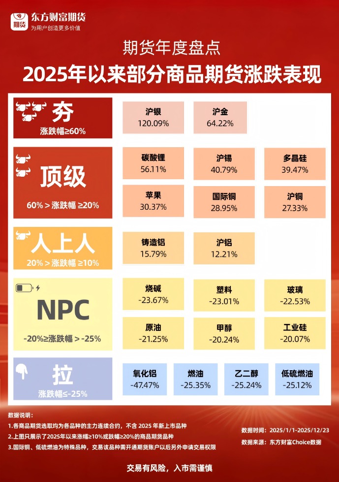 2025年期货市场收官倒计时!回顾2025年商品期货涨跌表现环球策路,我们梳理出涨跌表现较为突出的商品,「从‘夯’到‘拉’」。速来解锁吧!