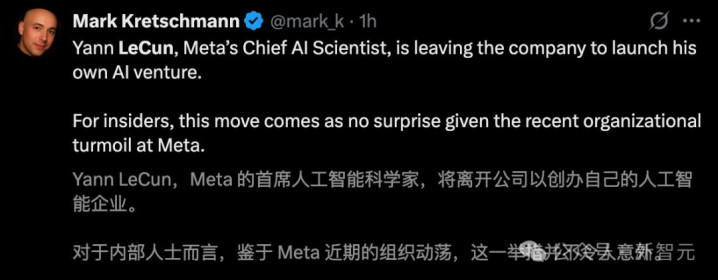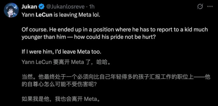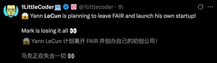 消息一出,瞬间引爆全网。此前,坊间传闻称,LeCun因不满内部架构调整想要离职。