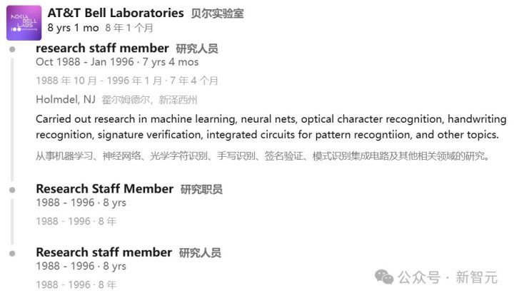 1988年,博士后研究结束时,LeCun加入了著名的计算机科学研究中心——贝尔实验室。